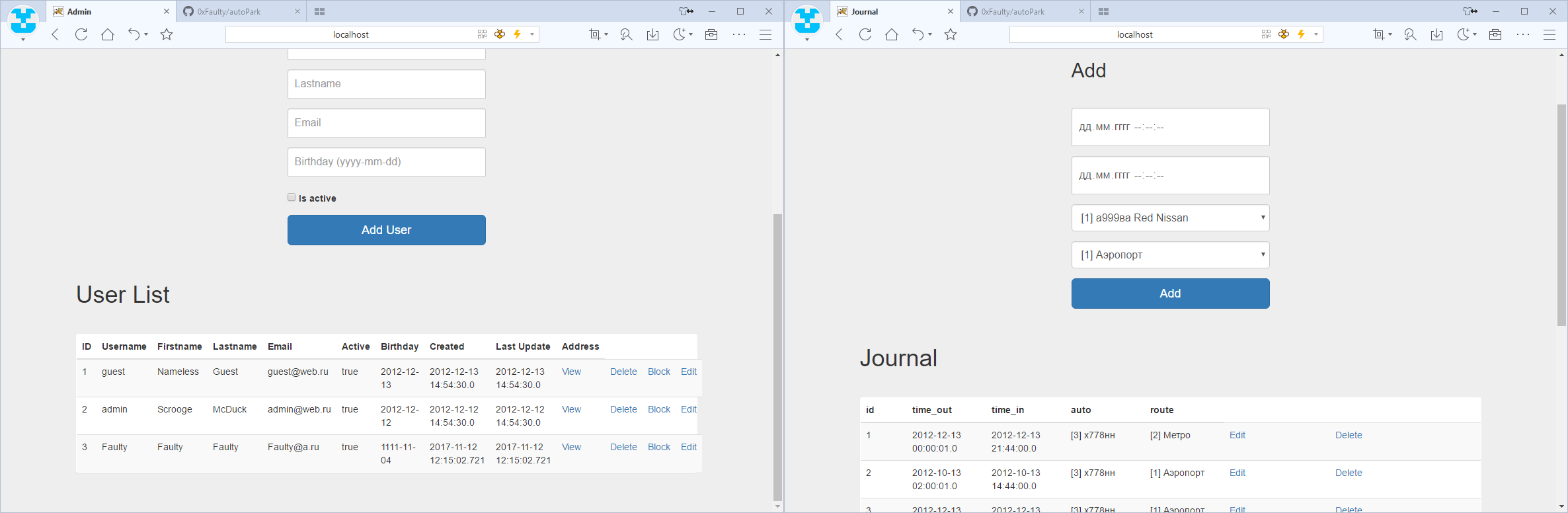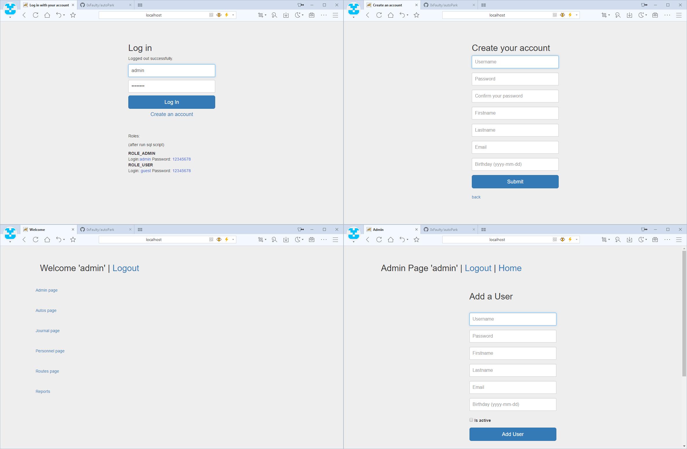 - Зайти на http://localhost:8080/autoPark/ для локального запуска или по адресу внешнего сервера при удаленном развертывании.