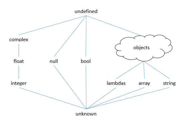 Read the diagram top-to-bottom like this: undefined is the super-type of everything, complex is the super-type of float, float is the super-type of int, etc.