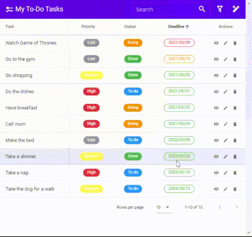 My To-Do Tasks CRUD To-Do Tasks made with Vue.js and Vuetify.js Demo Demo version of the project Preview Getting Start Project setup npm install Compiles and hot-reloads for development npm run serve Compiles and minifies for production npm run build