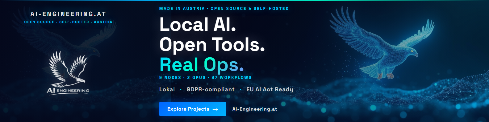 We build and operate local AI infrastructure. No cloud dependency, no data leaving your hands. 9 nodes, 3 GPUs, 37 workflows in production — self-hosted in Austria.