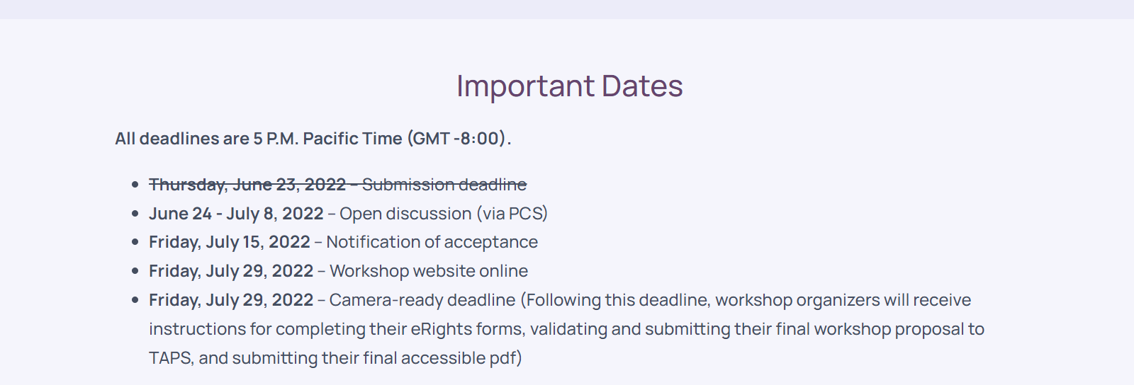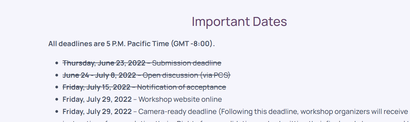 I noticed the workshop date strikethroughs have not been recently updated. I imagine this is the same for other pages as well. I just fixed it for the workshop page but not for other pages.