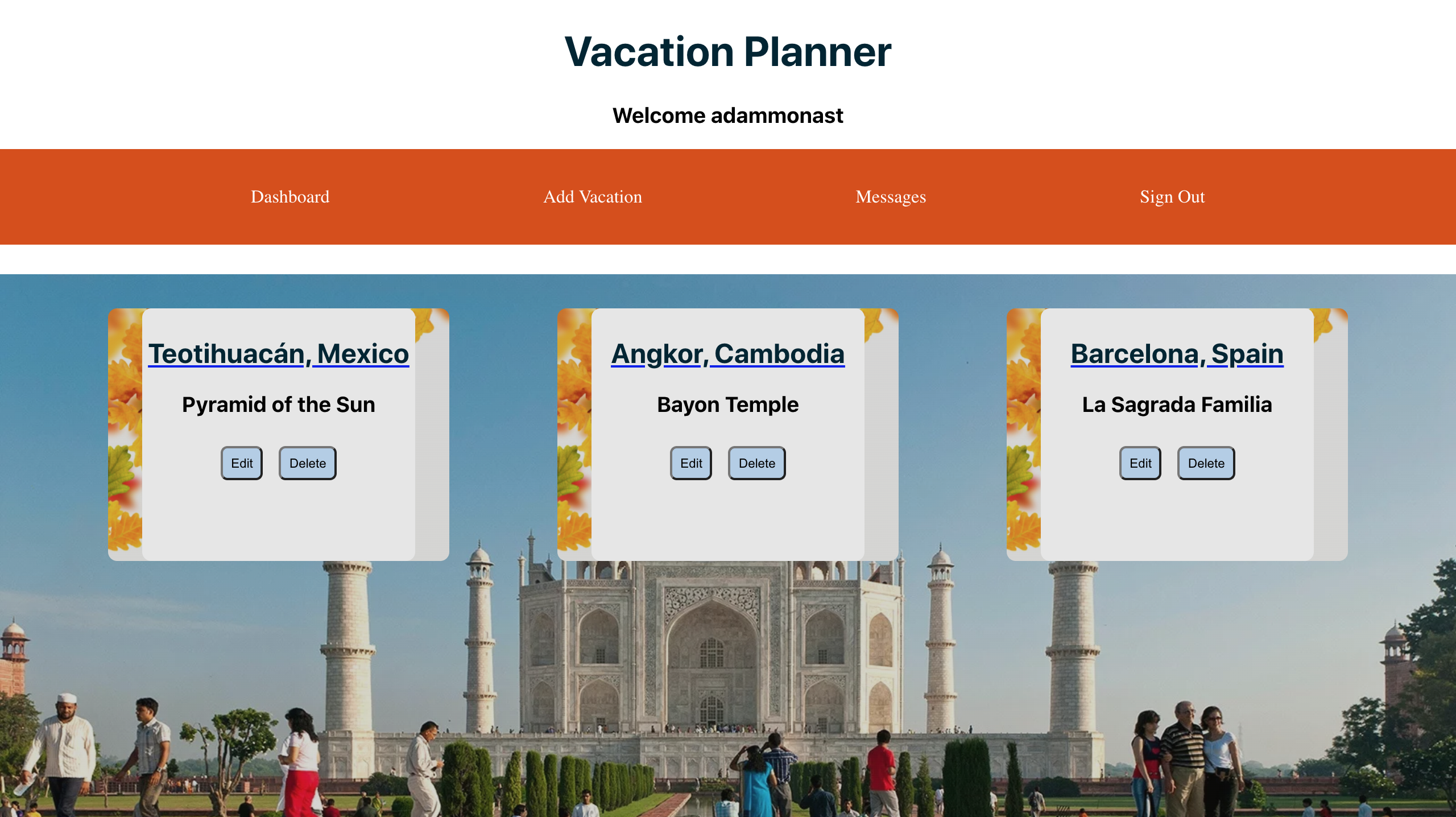 - Once you the sign-in/sign-up is flow is successfull, you're in the application! 🎉 You will be redirected to your Dashboard and from there the navigation bar links will change. You'll now have the ability to enter a new vacation, add activities, comments, other users to the vacation, and even send other users messages. Have fun!