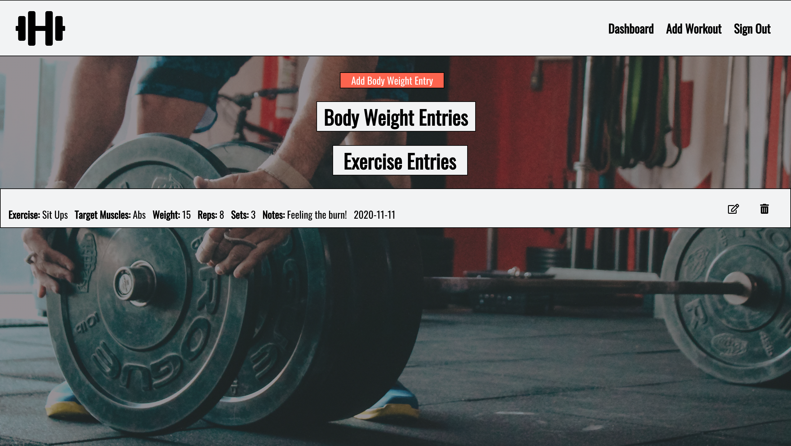 - Once you the sign-in/sign-up is flow is successfull, you're in the application! π You will be redirected to your Dashboard and from there the navigation bar links will change. You'll now have the ability to enter a workout entry!