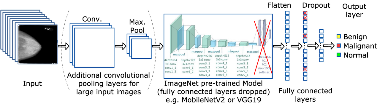 Ultimately, 67.08% accuracy is achieved on the CBIS-DDSM dataset by transfer learning pre-trained ImagetNet weights to a MobileNetV2 architecture and pre-trained weights from a binary version of the mini-MIAS dataset to the fully connected layers of the model. Furthermore, using class weights to fight the problem of imbalanced datasets and splitting CBIS-DDSM samples between masses and calcifications also increases the overall accuracy. Other techniques tested such as data augmentation and larger image sizes do not yield increased accuracies, while the mini-MIAS dataset proves to be too small for any meaningful results using deep learning techniques. These results are compared with other papers using the CBIS-DDSM and mini-MIAS datasets, and with the baseline set during the implementation of a deep learning pipeline developed as a group.