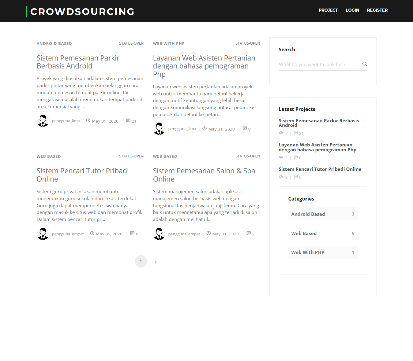 - Pengunjung yang melakukan login (Pengguna) memungkinkan untuk melihat postingan project orang lain dan memberikan kontribusi dengan melihat detail project.