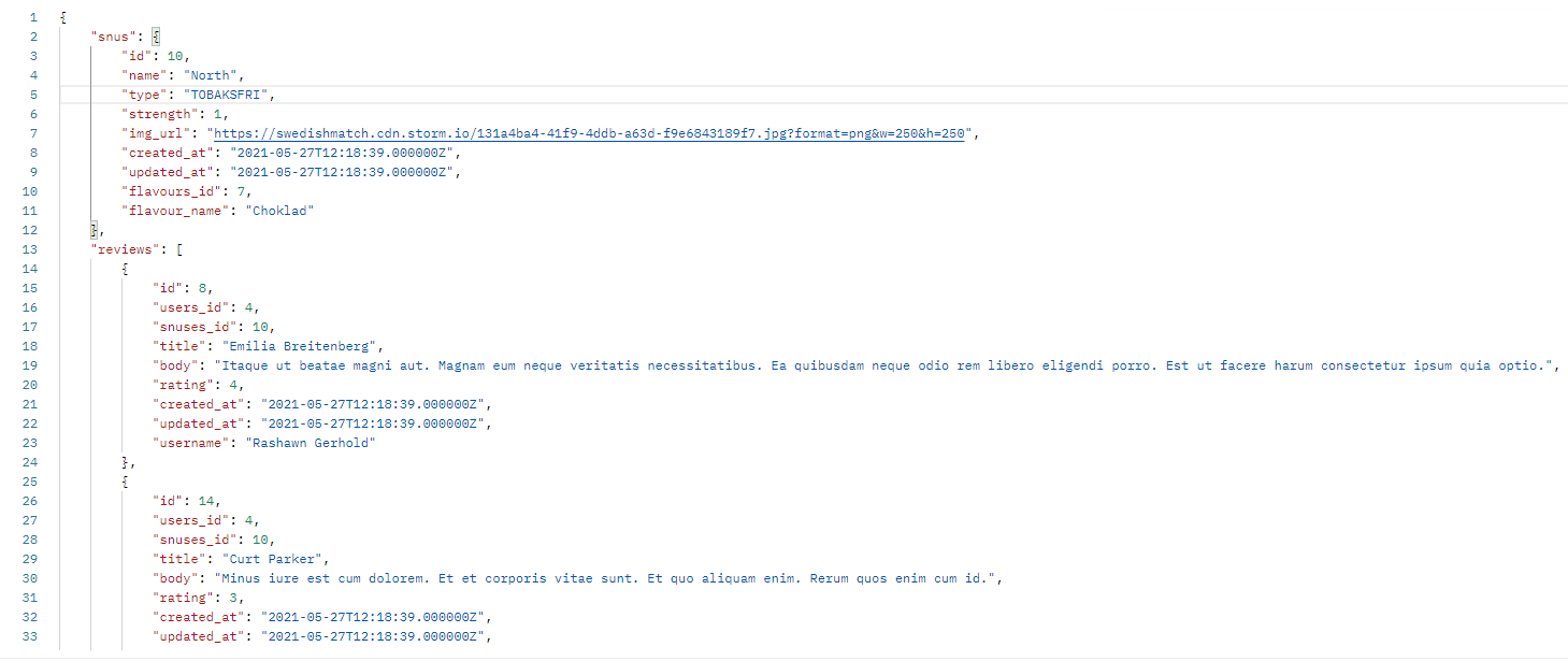 | /snuses/{id} | ger alla data om en snus baserat på id. benämnt snus |
