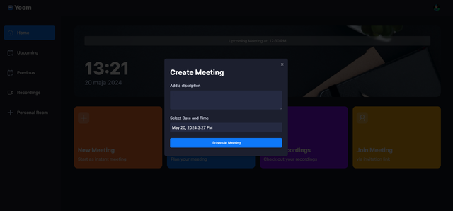 When you first enter the page, you going to see sing in / sign up form. I used Clerk Authentication. You may create a new account or log in via GitHub, Google or LinkedIn. To make a audio & video connection between users I used GetStream. Each user has possibility to create new meeting, schedule meeting, view recordings or join meeting via invitation link. An additional option is to create a private room. To styling project I used shadcn components.