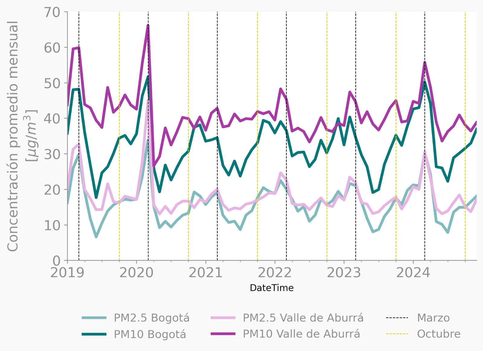 My experience working with air quality data in BogotΓ‘ and MedellΓn has shown how external contributions significantly influence local air pollution levels. The following graph illustrates monthly average PM2.5 and PM10 concentrations in both cities, highlighting seasonal variations and long-term trends: