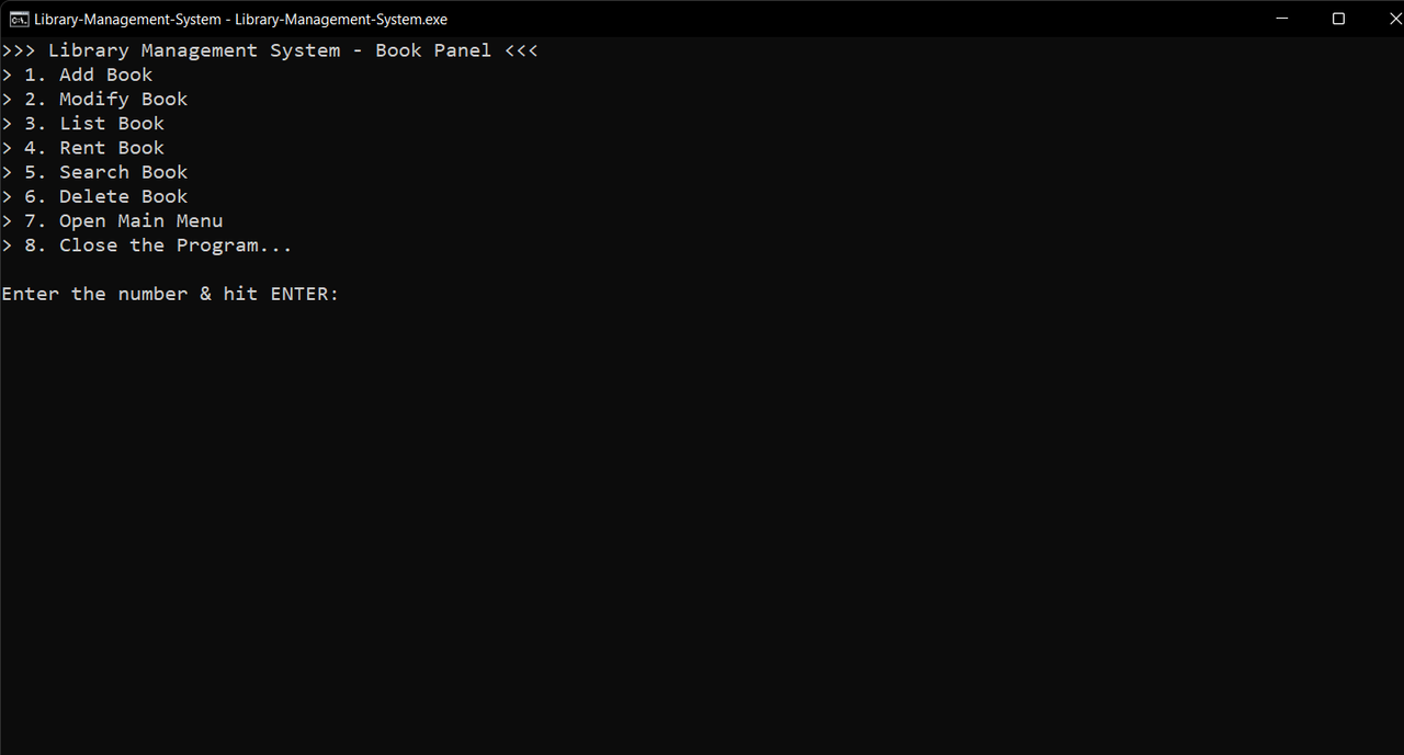 The Library Management System is secured with a layer of authentication password for protecting the files from unauthorized access of strangers. Enter the password and hit ENTER. The password will not be shown publicly, it will shown in ***** format. Read the comments in the code to better understand how it works!