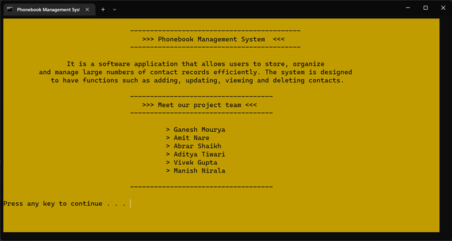 Phonebook Management System in the C programming language is a software application that allows users to store, organize and manage large numbers of contact records efficiently. The system is designed to have functions such as adding, updating, viewing, listing and deleting contacts.