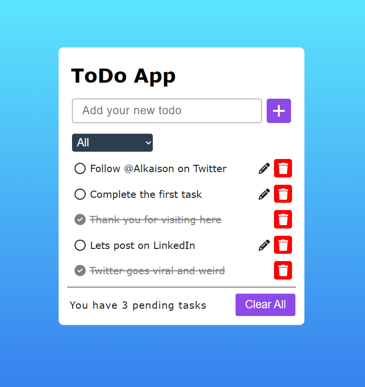 - Clear All Tasks: If you want to start fresh or remove completed tasks in one go, you can use the "Clear All" button to delete all tasks.