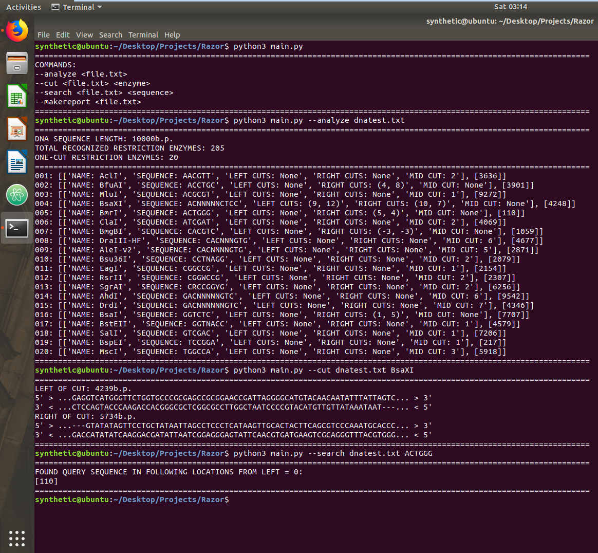 python3 main.py --cut dnatest.txt <enzyme name copied from analysis list> - To use the search function type: