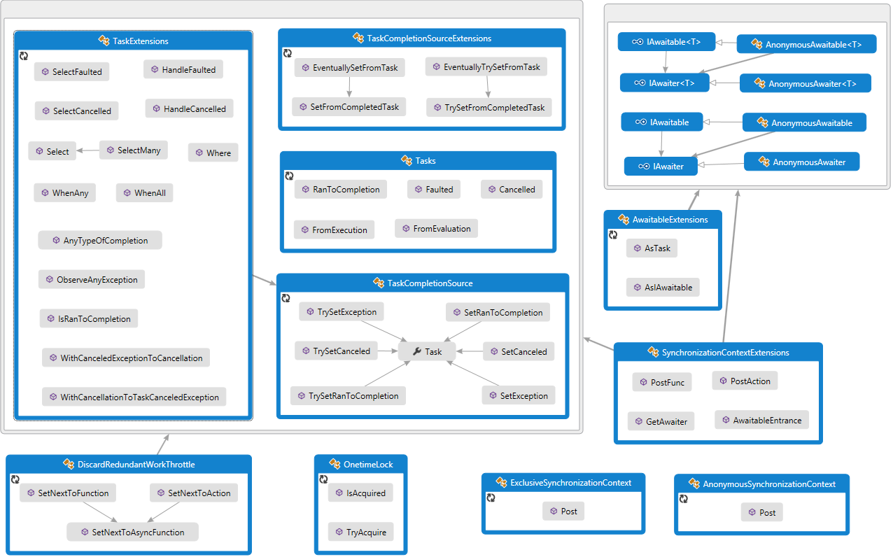 - Extension methods to set task completion sources based on existing tasks (EventuallySetFromTask, TrySetFromCompletedTask, ...)