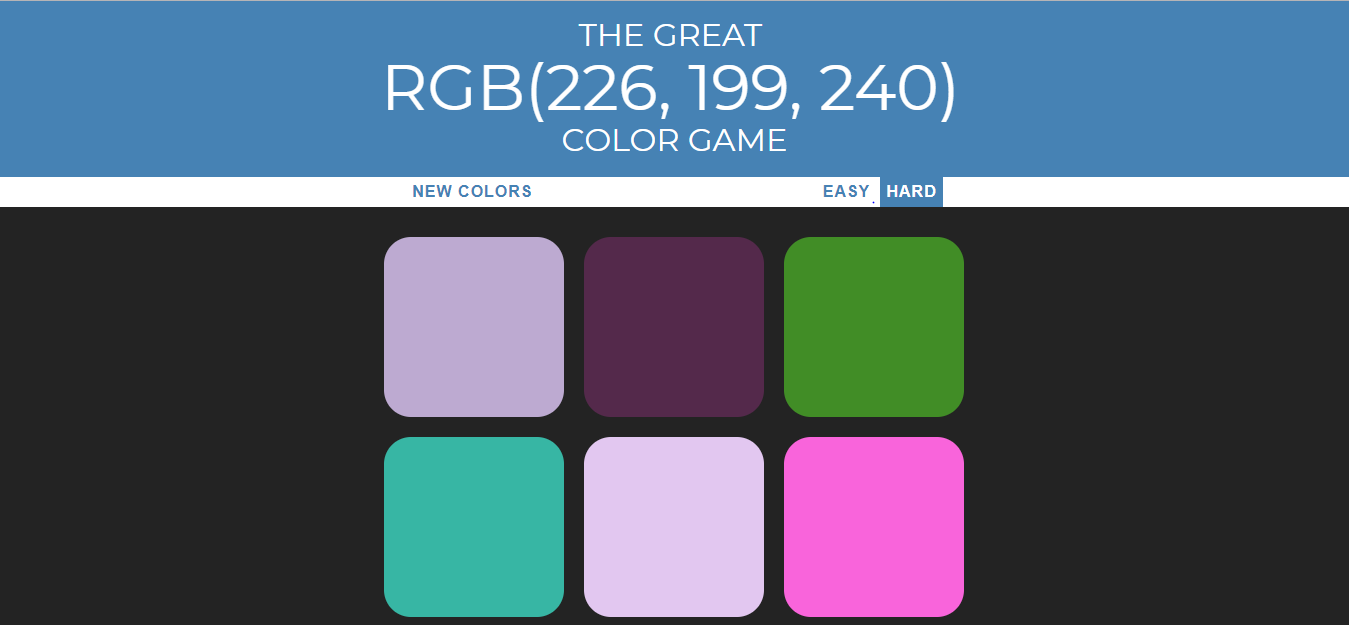 Color Game This game is a color guessing game made with HTML, CSS, JavaScript & DOM manipulation. Feel free to make any modifications! Sample Screenshots :