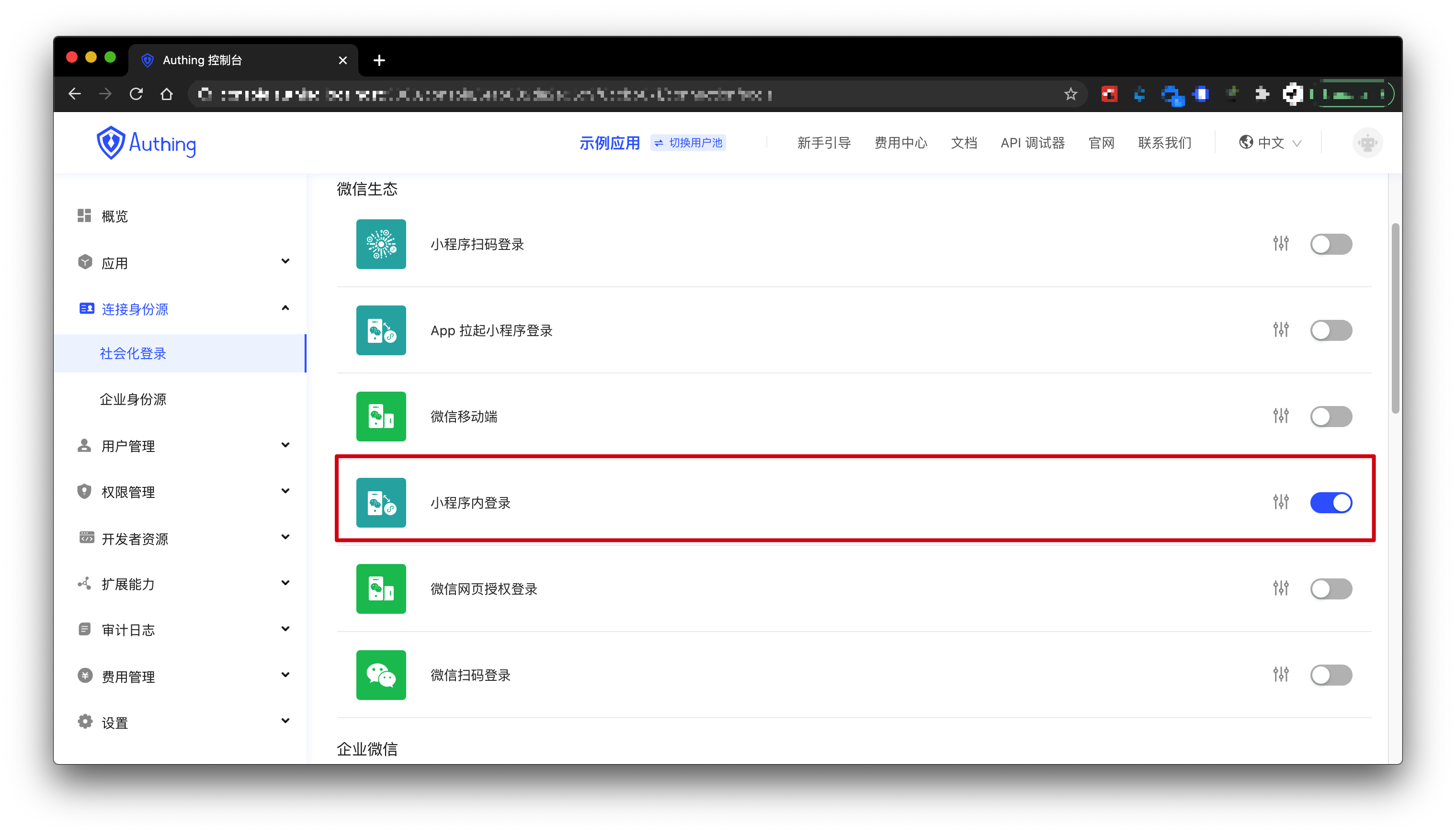 - Go to Authing 控制台 Connect identity source - Social login - Login in Miniapp:
