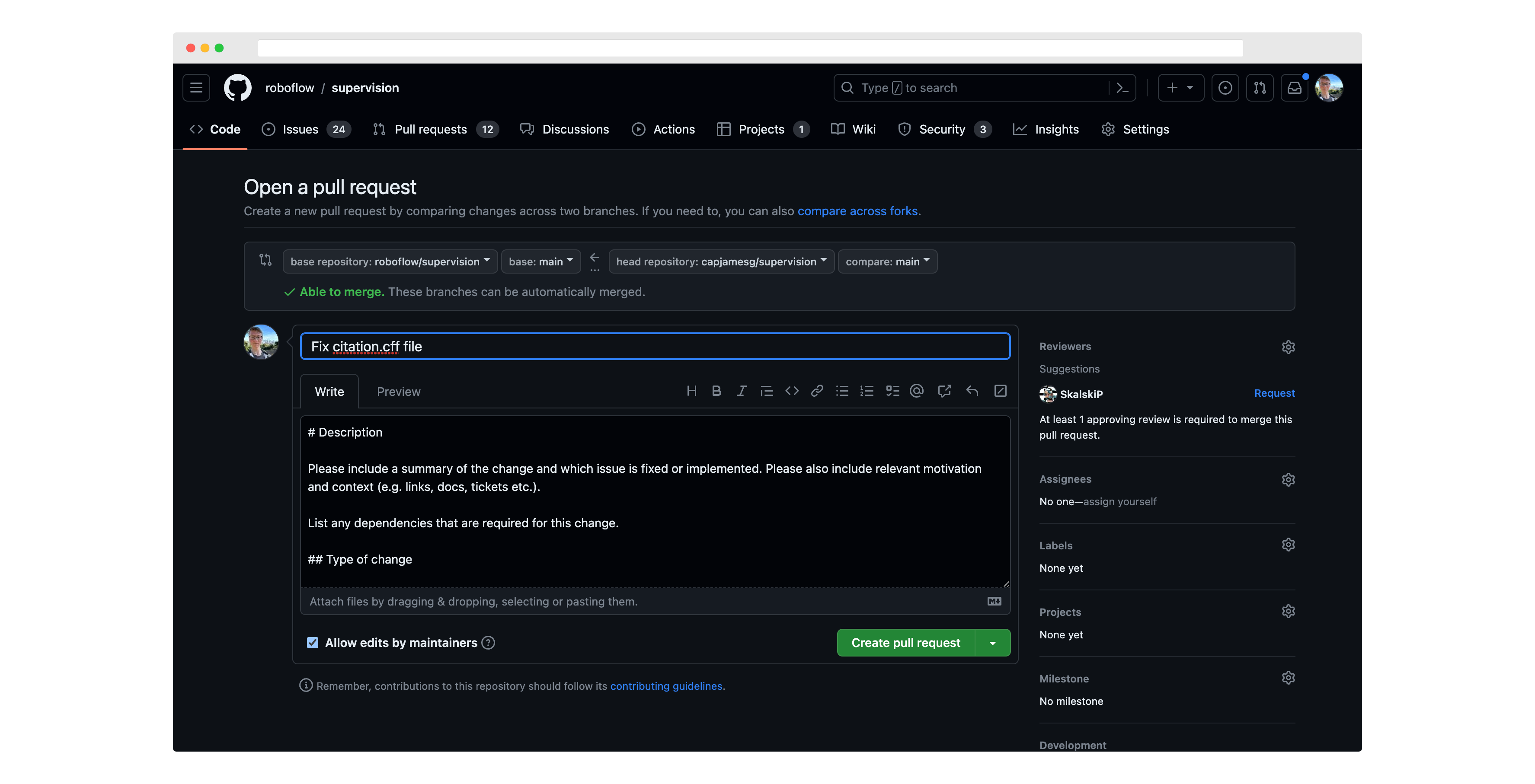 Then, go back to your fork of the supervision repository, click "Pull Requests", and click "New Pull Request".