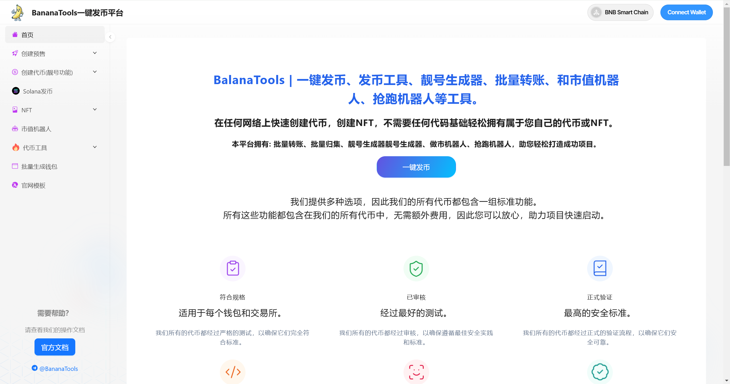 BananaTools是领先的Web3.0工具平台,提供可视化的界面,支持Eth、Bsc、Solana一键发币,让用户能够快速创建、部署和管理自己的加密货币,而无需编写代码。此外,BananaTools还提供一些附加功能,如批量转账、批量生成账号、市值管理等