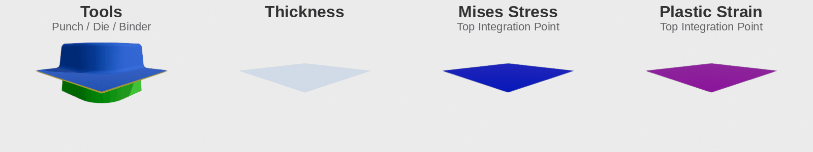 Simulation with the tool geometries and various additional information like sheet metal thinning, stress and strain.