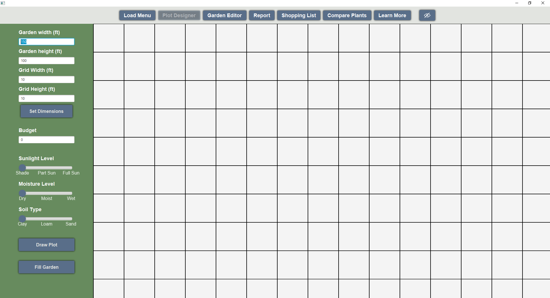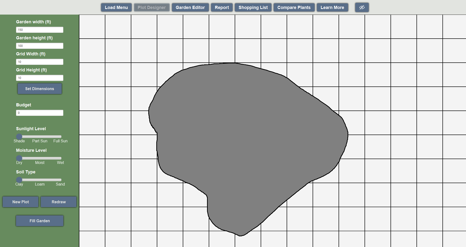 This will bring the user to the plot designer screen. This screen has an easy to use plot selection and free drawing system that makes it simple and easy to create garden plots of any size. Users can set their height and width dimensions in feet, pick their budget, and draw plots based on the settings used in the three sliders. Choosing different slider options will curate the plants that show up in the next screen. The color of the drawn plot will also change depending on which soil option the user selects. Allowing for the creation of multiple distinct plots in the garden. After creating a plot, users can click the fill garden button to complete the plot designer process and travel to the garden editor screen.