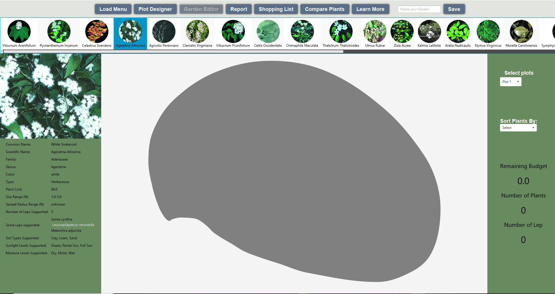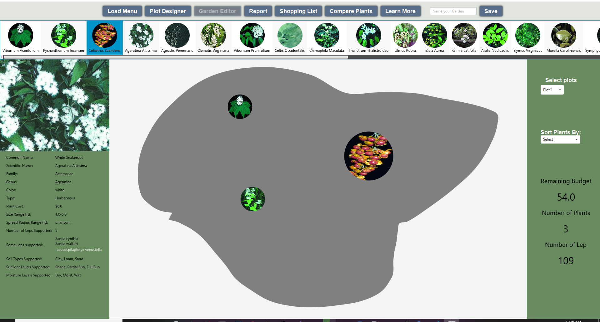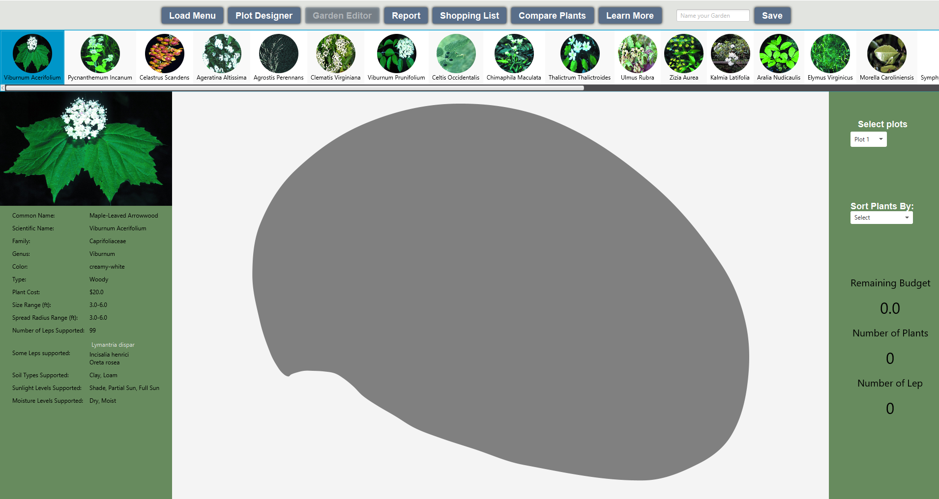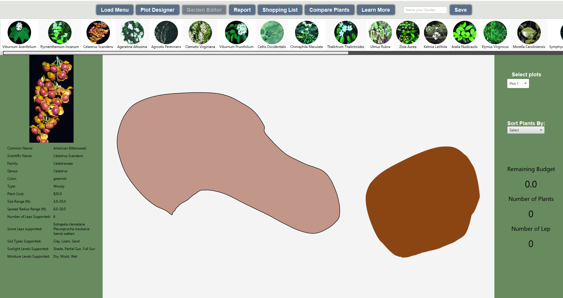 Below the two drop down menus, the ‘remaining budget’, ‘number of plants’, and ‘number of leps’ sections will update as plants are added to the garden.