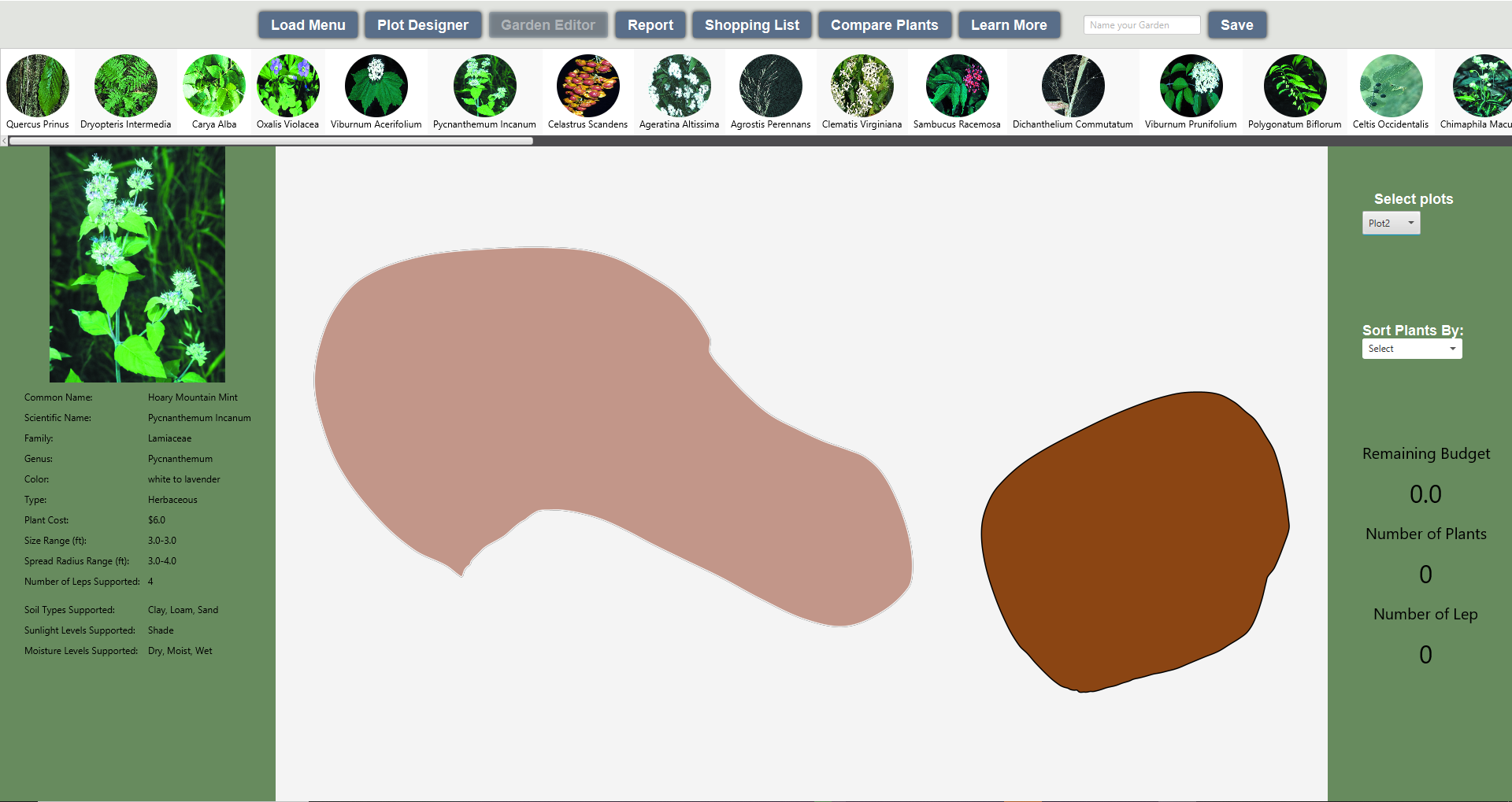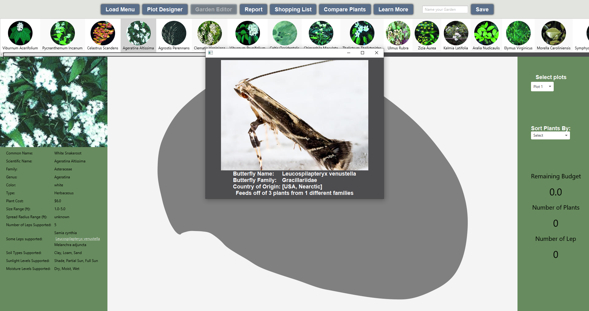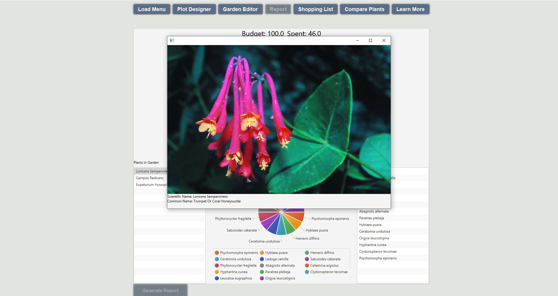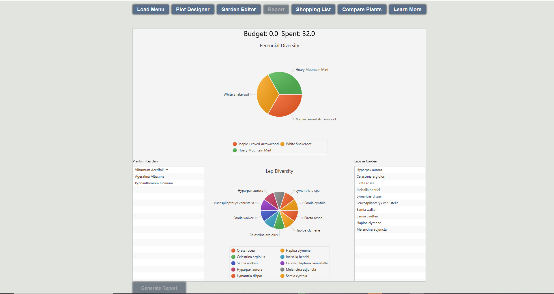 A generated report contains important information about the garden. This information includes the budget, along with plant and lep diversity information. On the left side of the lep diversity pie chart is a table containing all plants in the garden. On the right hand side of the lep diversity pie chart is a table containing all leps in the garden. By clicking on a specific lep or plant, a popup will appear containing an image and additional information.