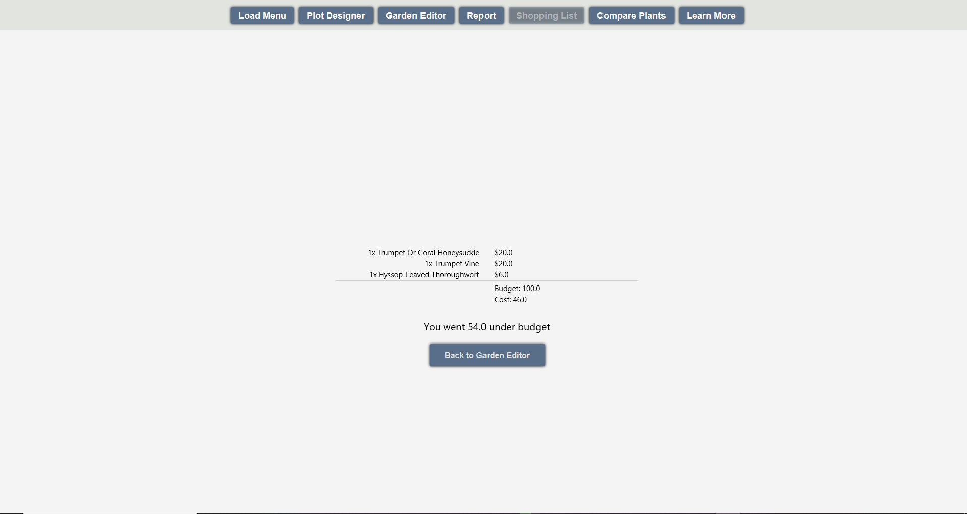 In the shopping list section of the program, a tally of all plants, and the total cost is displayed. The total amount over or under the budget is also displayed.