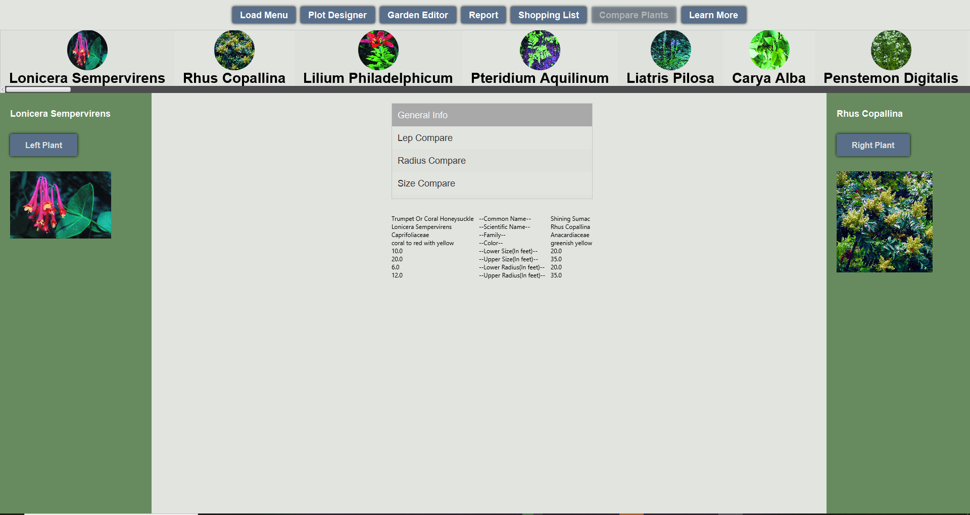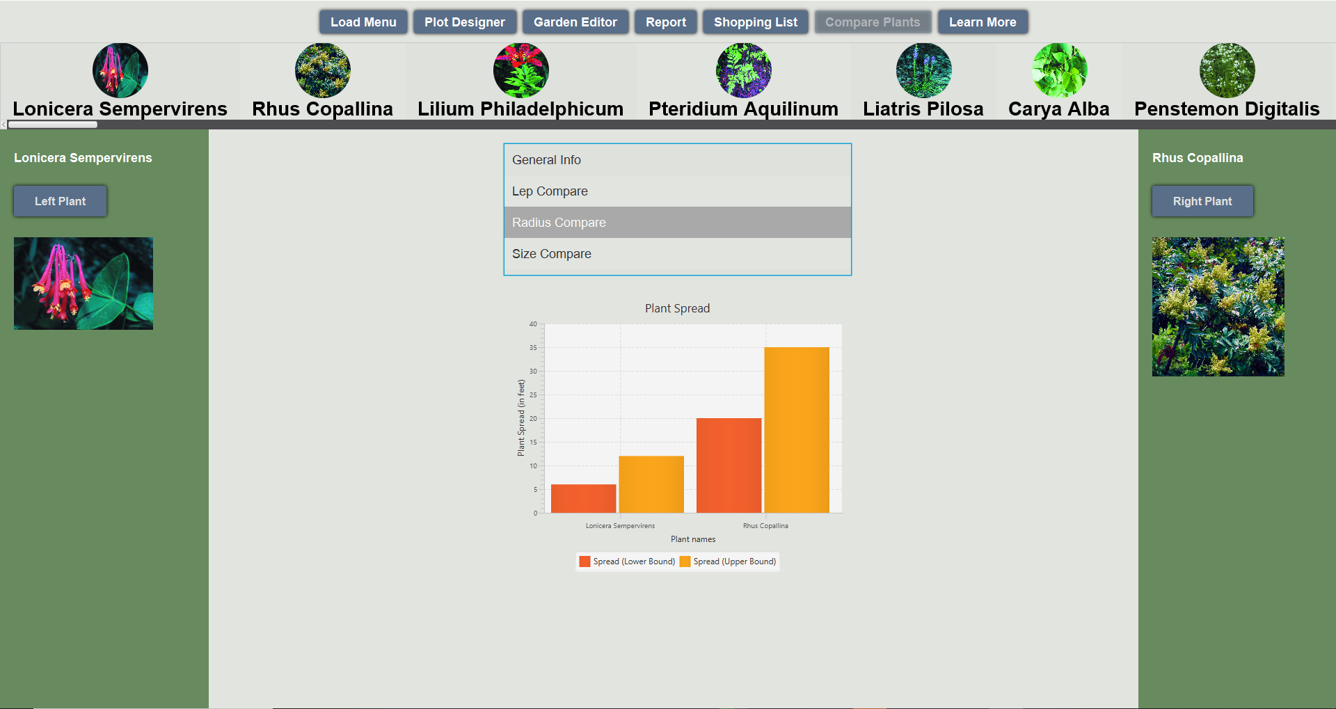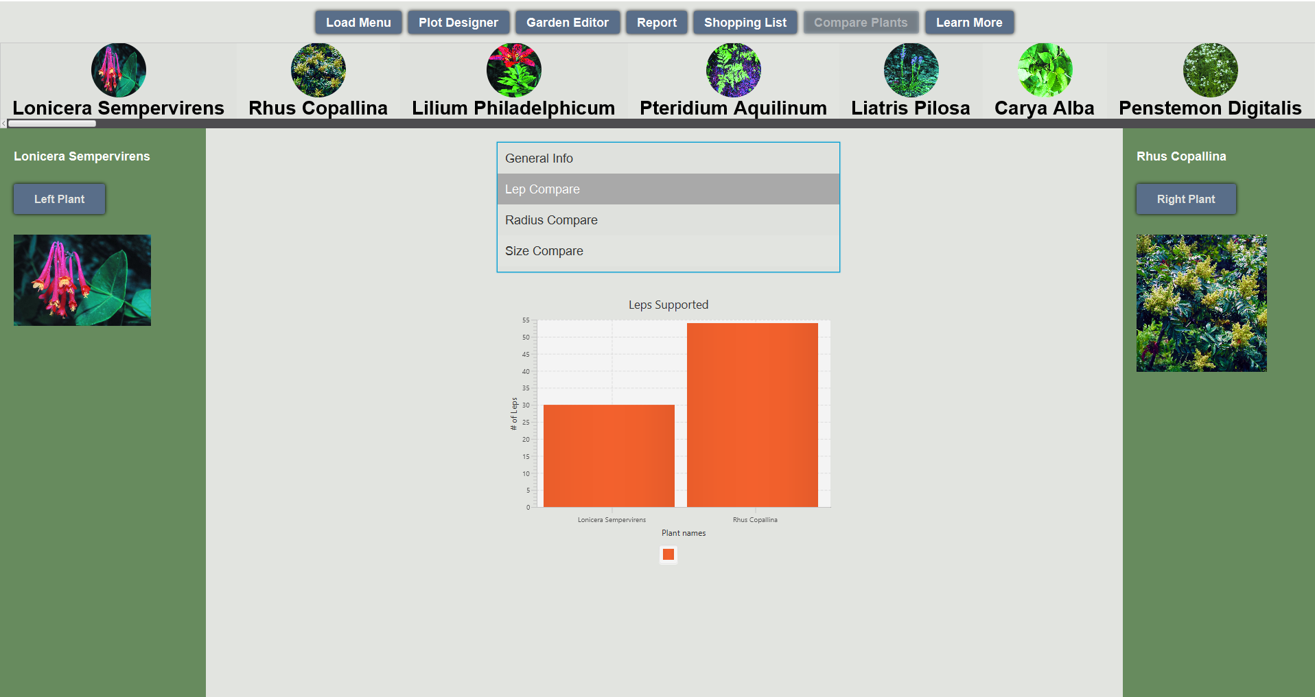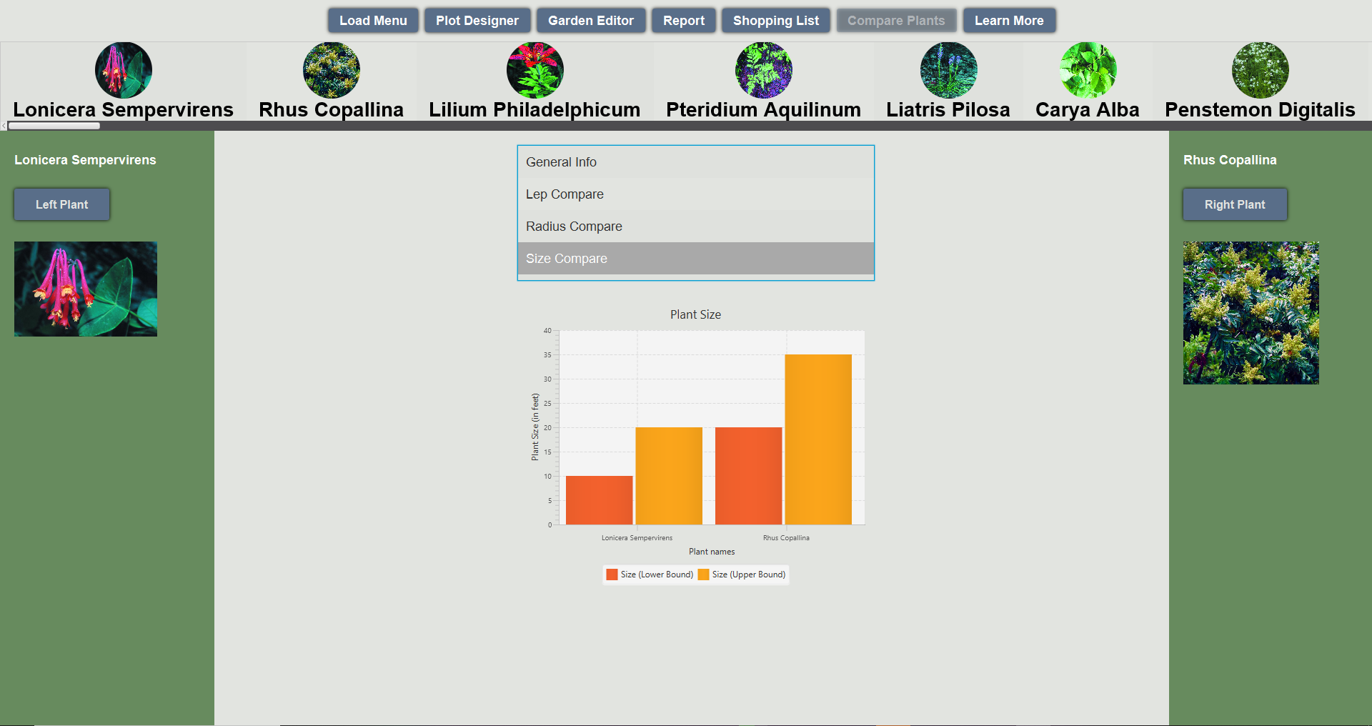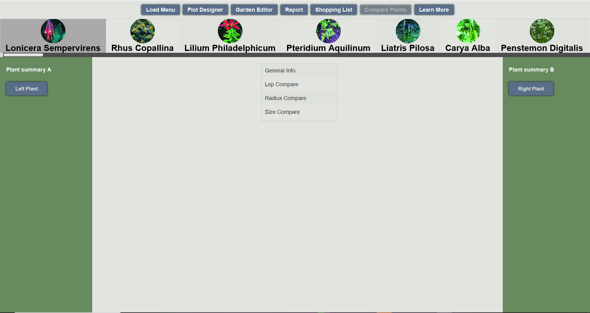 In the Compare Plants section of the program, two plants can be selected for comparison from the list of recommended plants on the top. When two plants are selected, one of four options can be chosen.