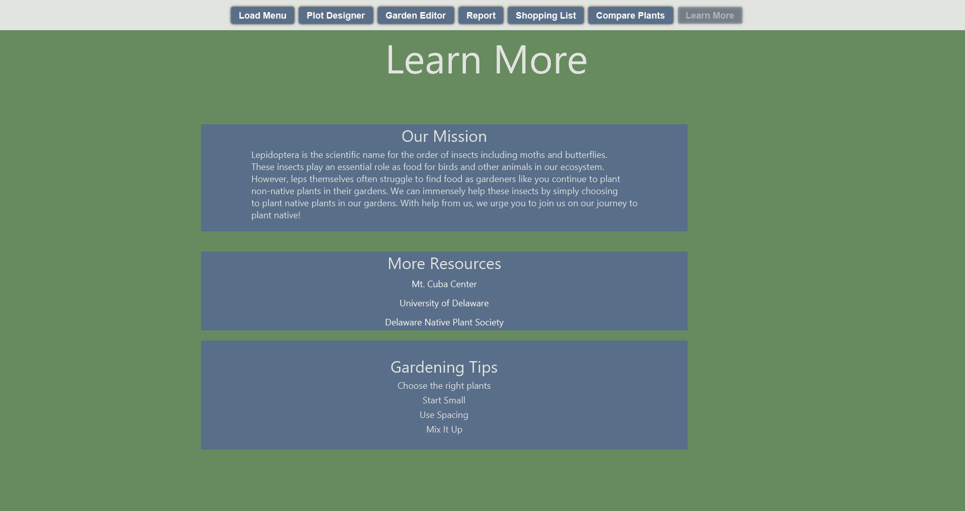 The learn more section of the program provides information about gardening, along with resources about local perennials, plants, and leps.