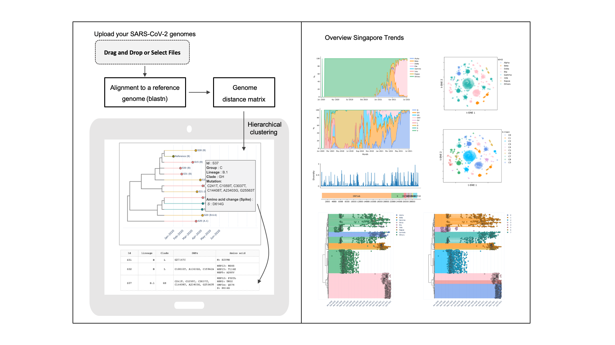 python preprocess.py genome_dir reference.fasta gene.tsv clade.tsv name_by_who.tsv preprocess world_metadata.tsv Singapore -1python covid_app.py preprocess CalmBelt is based on Dash/Flask framework (default port = 8050), and users can access the website at http://localthost:8050. Additional information for deploying CalmBelt on a remote server is avilable upon request.