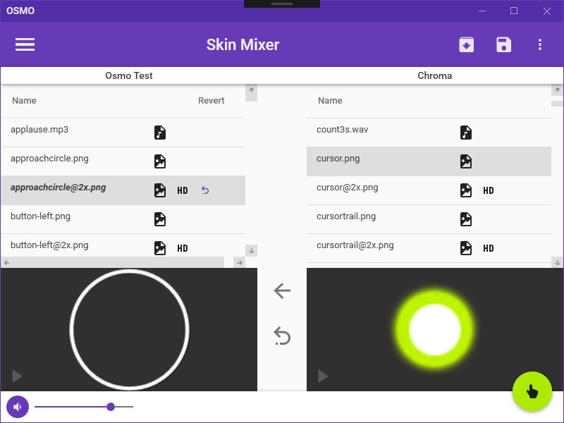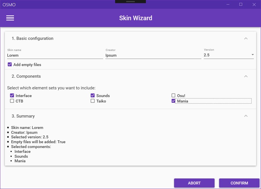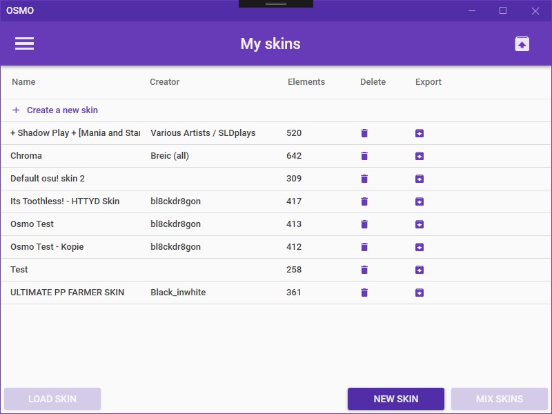 OSMO stands for "Open Skin Manager for osu!" and builds upon the old Skin Manager from 2014. It uses the Material Design In XAML Toolkit to give you a clean and easy to navigate UI.