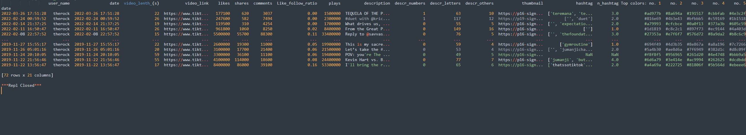 posts_data: [generic] likes, comments, views, shares, thumbnails, description, date, @tags, #tags, etc.. [special] like-to-follow ratio, number of words and special characters in the description, and the top 5 colors used in the post/thumbnail.