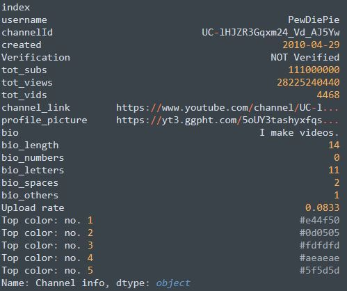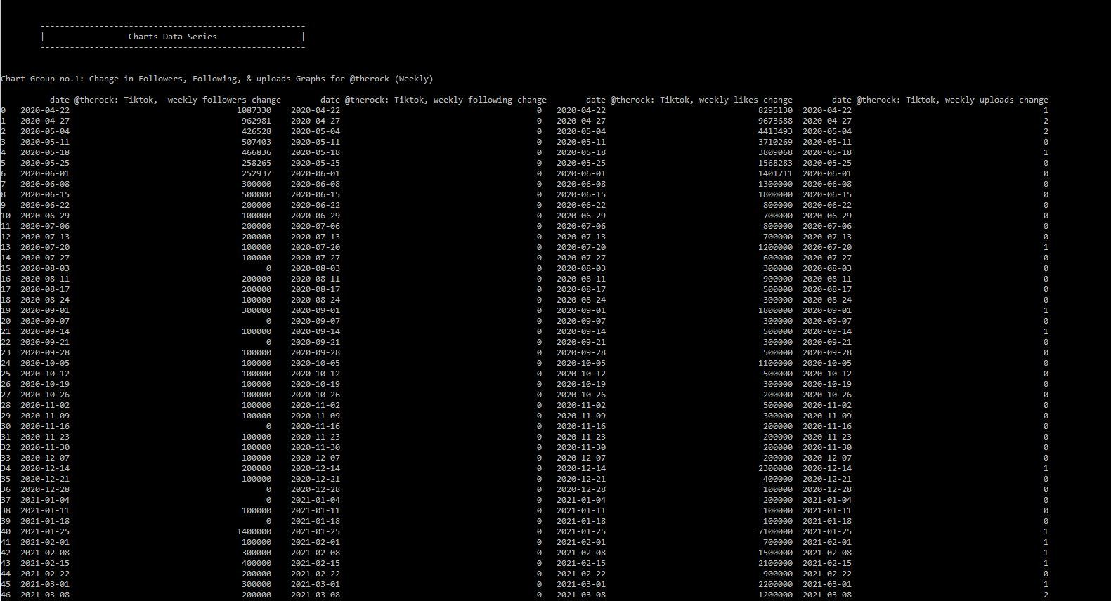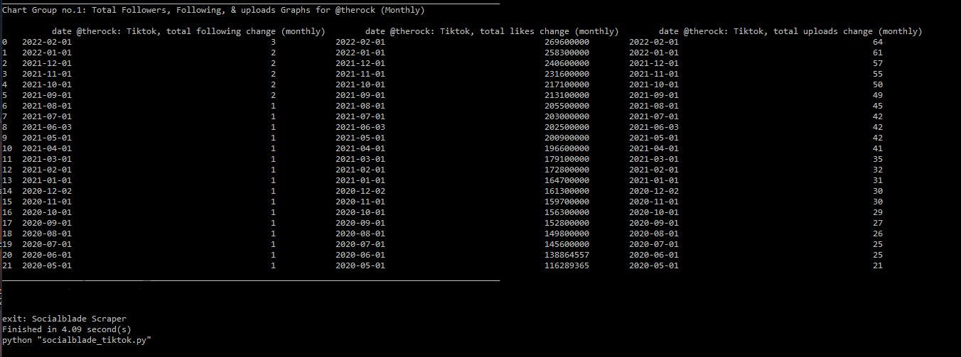 Socialblade had another challange for me, since they both html and javascript in their code. Since I don't know any javascript I had to learn a bit of it and then find a way for my python code to read javascript so it could extract the code from it. A simple library named "js2py" did the trick nicely.