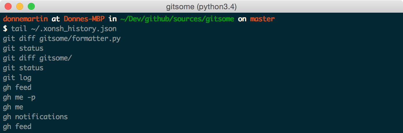 gitsome keeps track of commands you enter and stores them in ~/.xonsh_history.json. Use the up and down arrow keys to cycle through the command history.