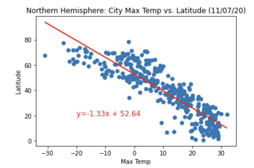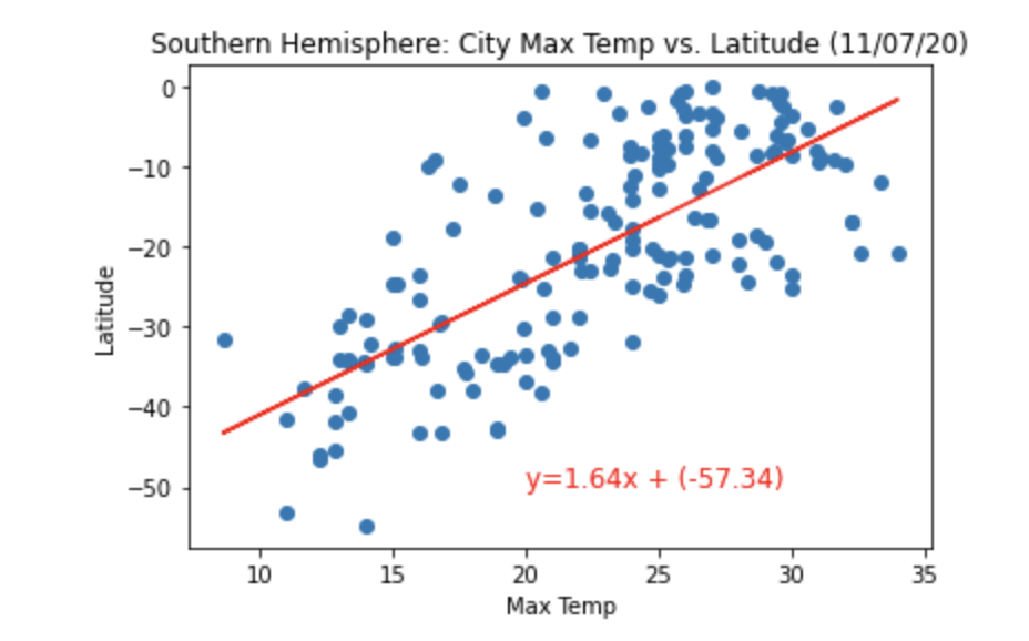 The notebook also contains the linear regression analyses performed on both Northern Hemisphere (greater than or equal to 0 degrees latitude) and Southern Hemisphere (less than 0 degrees latitude):
