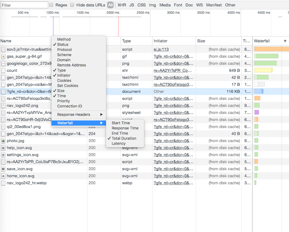 Так же график Waterfall может показывать не только время страта запроса, но и другие вещи, включая Total Duration, что может быть очень полезным при выявлении сетевых проблем: