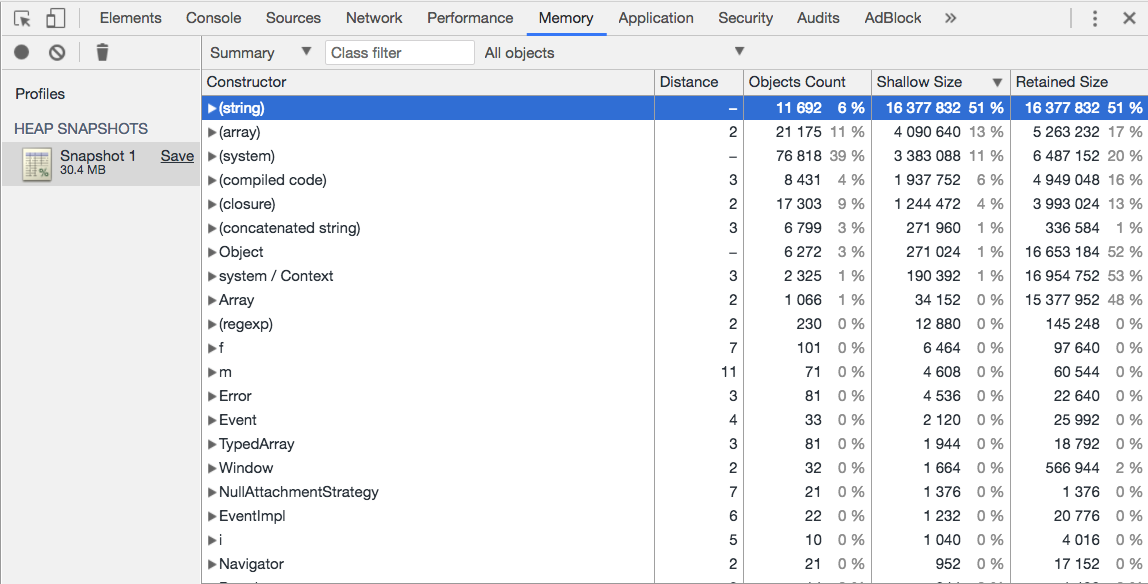 В данном снепшоте вы сможете увидеть текущий срез кучи js, а так же посмотреть что именно занимает наибольшее место в памяти:
