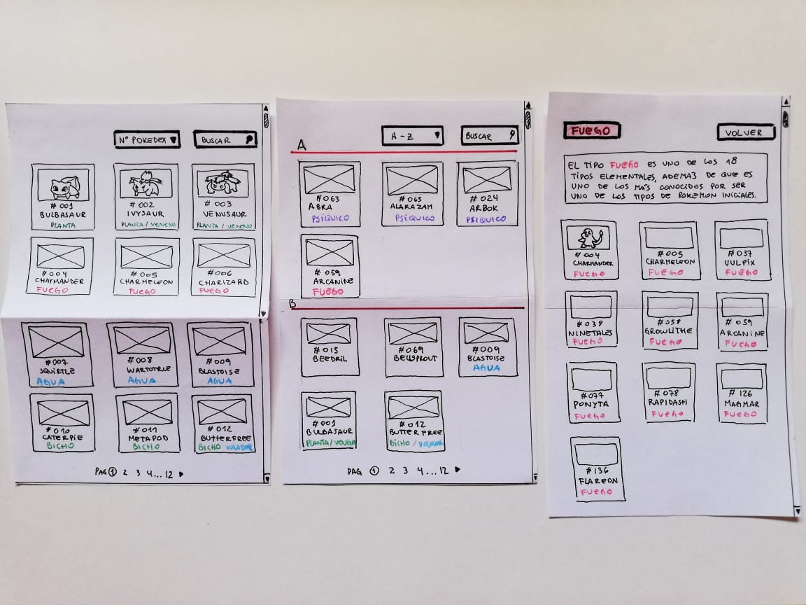 Prototipo de baja fidelidad, una serie de sketch que se utilizó para testear como el usuario realiza el recorrido sobre la información contenida dentro de la aplicación, con el objetivo de sacar una serie de conclusiones e implementarlas en el siguiente testeo.