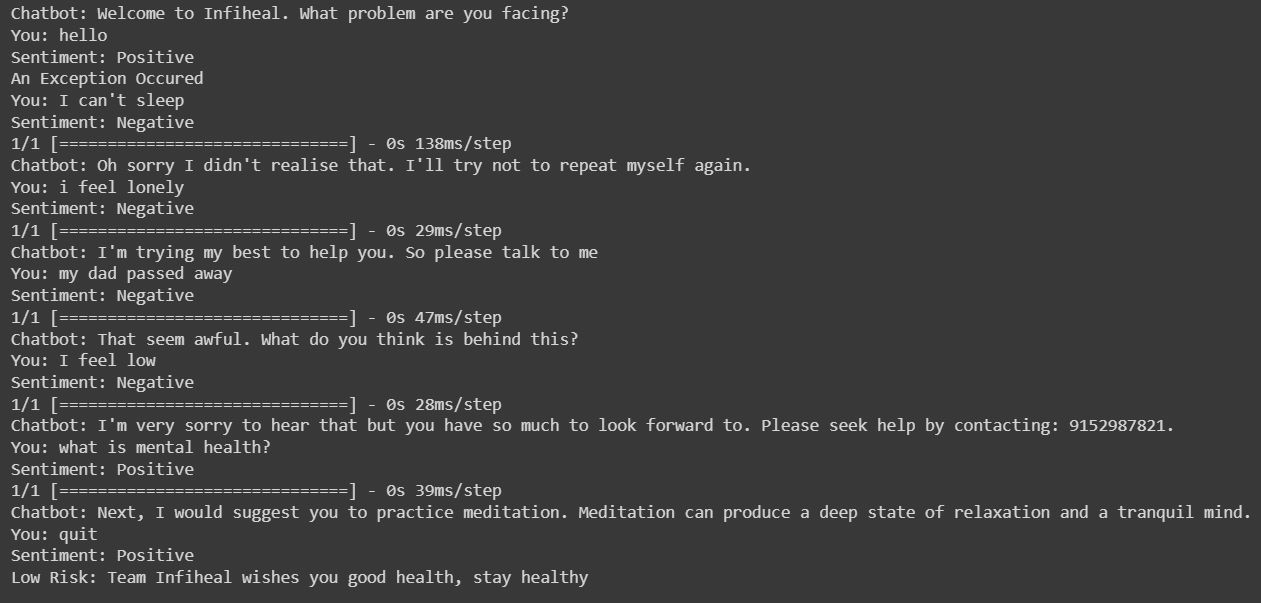 - If the model classifies tha chat to be high risk, it is directly connected to the nearest distress helpline.