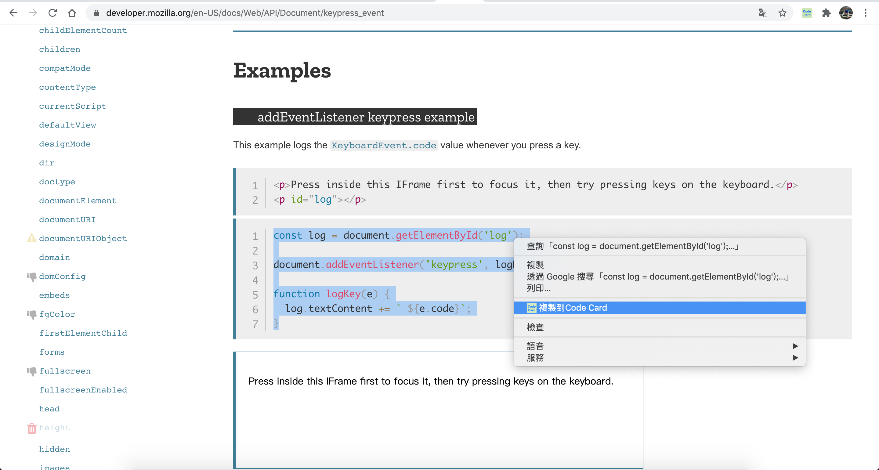 - 到有 code 的網站,選取想記錄的 code