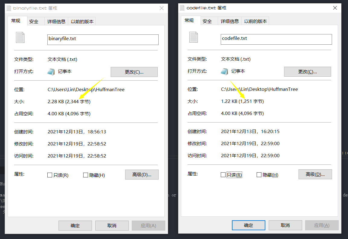 - 对比二进制编码和哈夫曼编码后的文件字节大小,并计算压缩率