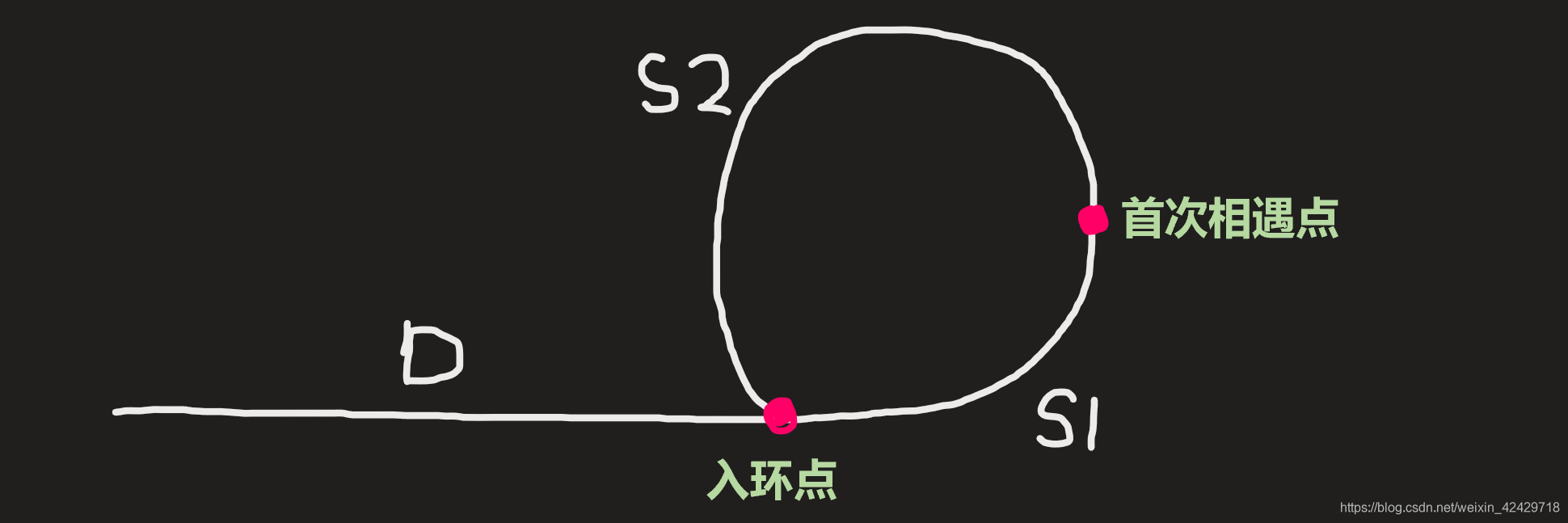 假设相遇时快指针已经绕环 n 次,它走的距离:D+n(S1+S2)+S1D+n(S1+S2)+S1