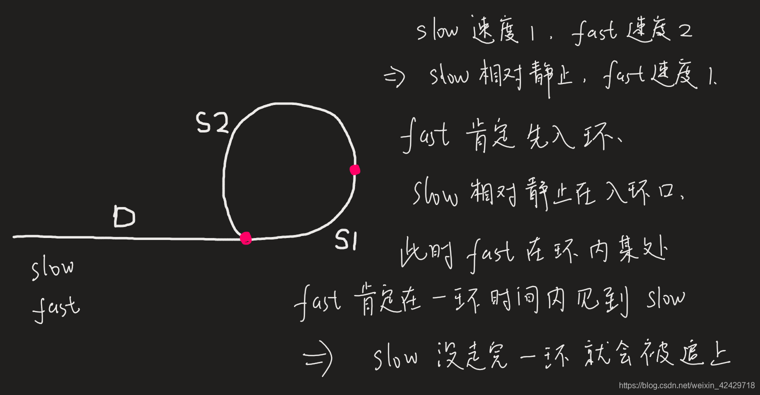 那么,当快慢指针第一次相遇时,将快指针放回到头节点,由于 D=s2,那么我们快慢指针一起走,都走1步,它们必定会走到入环点,然后相遇,此时就可返回对应指针下标。
