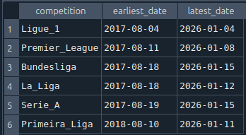main.pyis set to process the 2024-2025 season for the top 6 European leagues. You can modify thecompetitionsandseasonslists to include/exclude the leagues and seasons you want to process.competitions = ["Premier_League", "Bundesliga", "La_Liga", "Ligue_1", "Serie_A", "Primeira_Liga"] seasons = ["2023-2024", "2024-2025"] main("master.db", competitions=competitions, seasons=seasons)