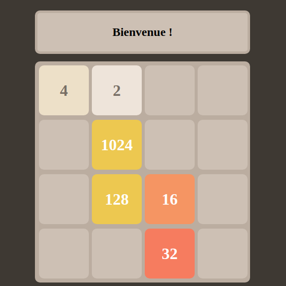 Simple 2048 game, with N X N rows/columns, made in few hours. Player choose how many rows/columns and try to beat the game. Controls Use the arrow keys Screenshots Play at the game You can play the game at: alexandrechartrand.ca/projects/2048/html (link need to be updated)