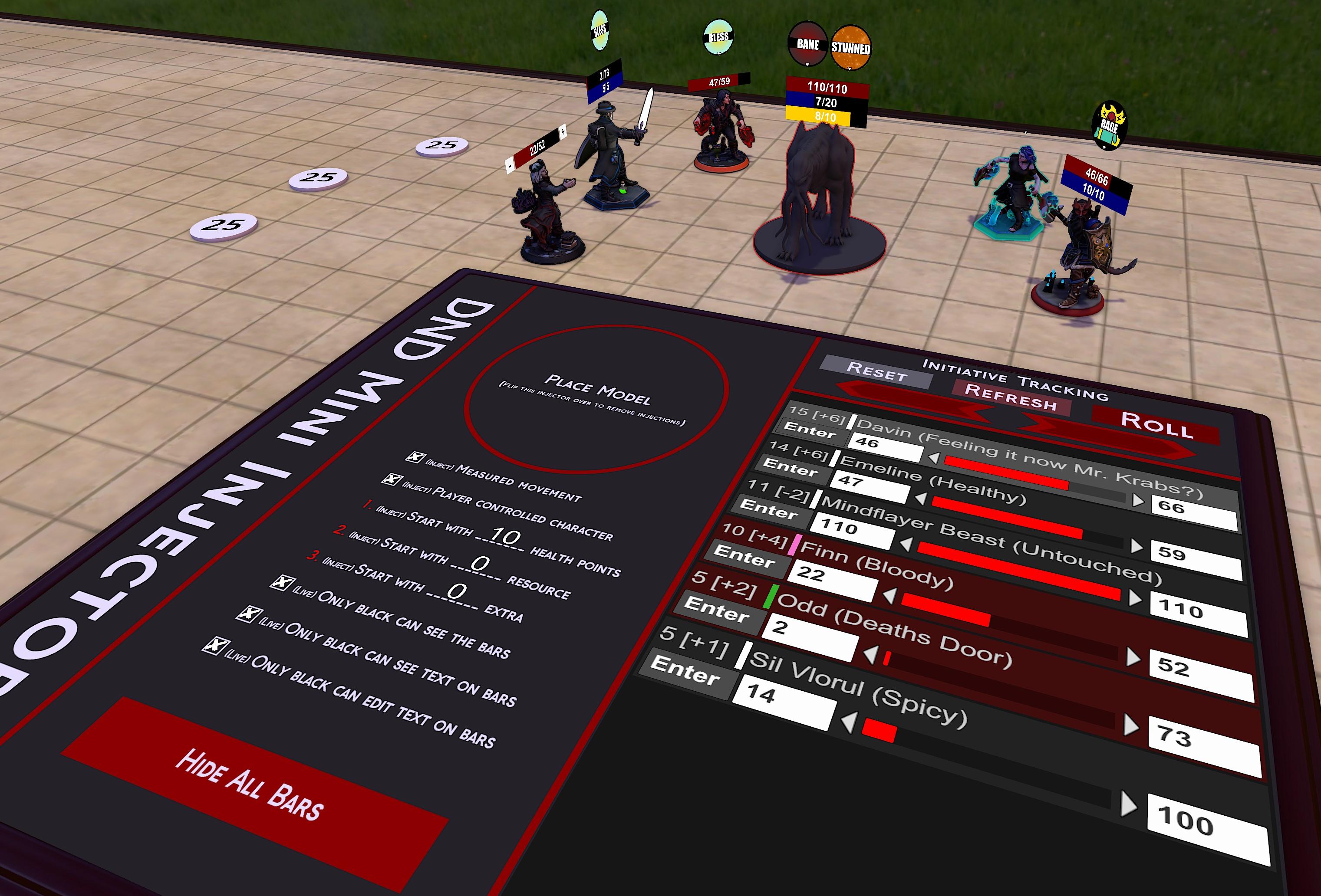 - Injected UI has 3 bars for information in red/blue/yellow. Red is used for health, the other two can be used for whatever suits you. Click the right side of the bars to show/hide bar adjustment buttons. Bars for PC minis are visible to everyone, and global visibility for NPC minis is optional.