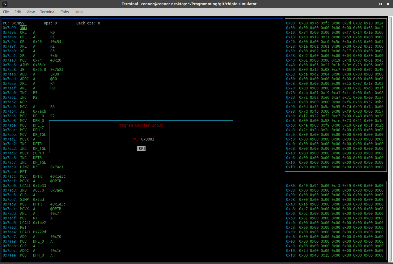 The breakpoints for PC and DPTR are toggled by hitting enter when their labels are highlighted. If the condition for these breakpoints are met while using the multi-step arrows in the main window, it will stop before reaching the step count at the specific instruction that met the condition. The only conditions currently available are PC address and dptr address.