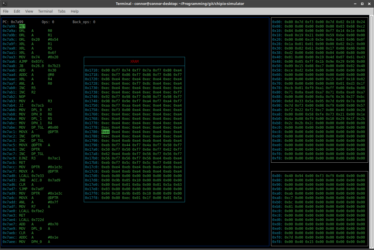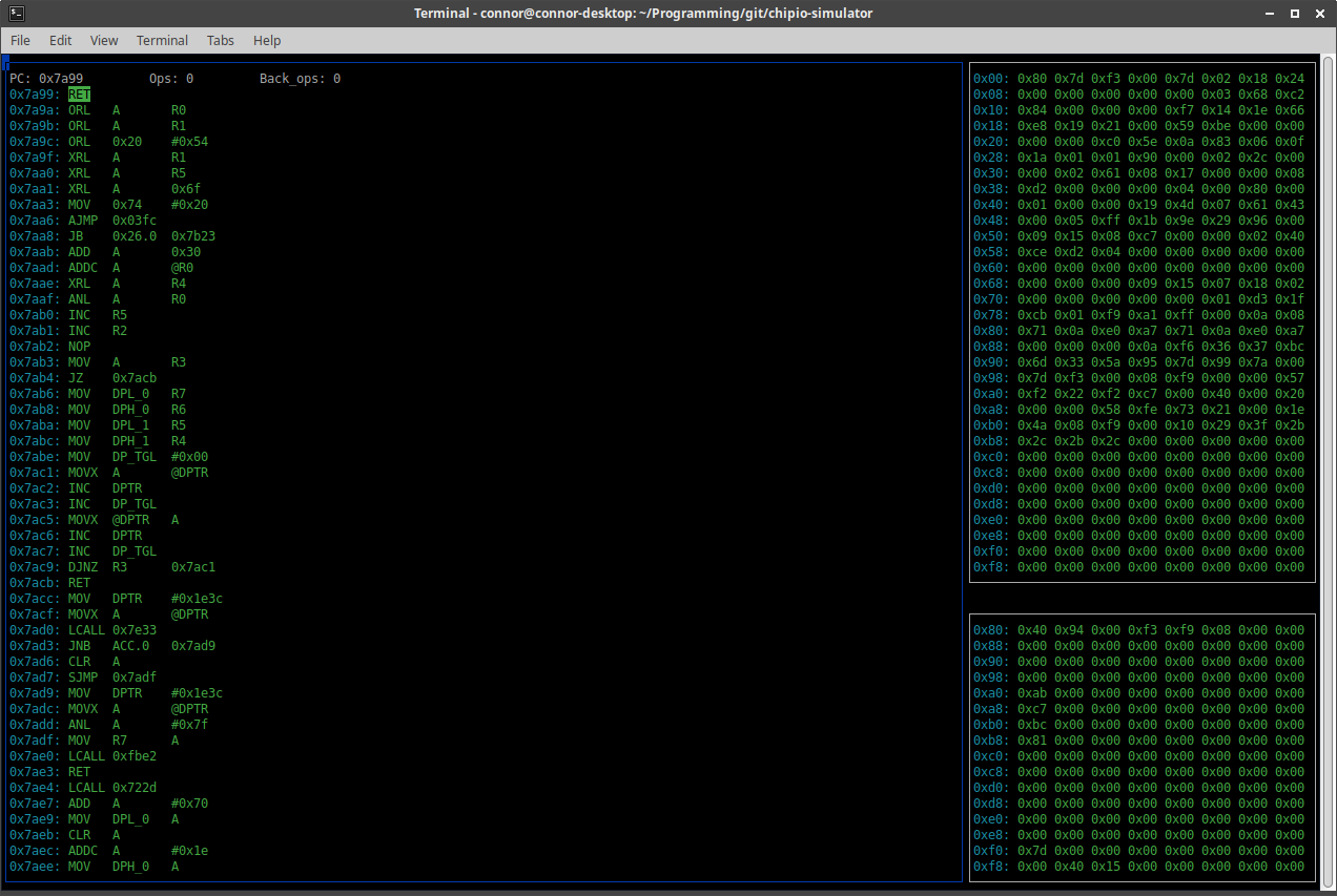 This is the main window of the simulator. By pressing tab, you can switch between the three separate boxes, the main on the left being the instructions, the top right being the IRAM, and the bottom right being the SFR's.