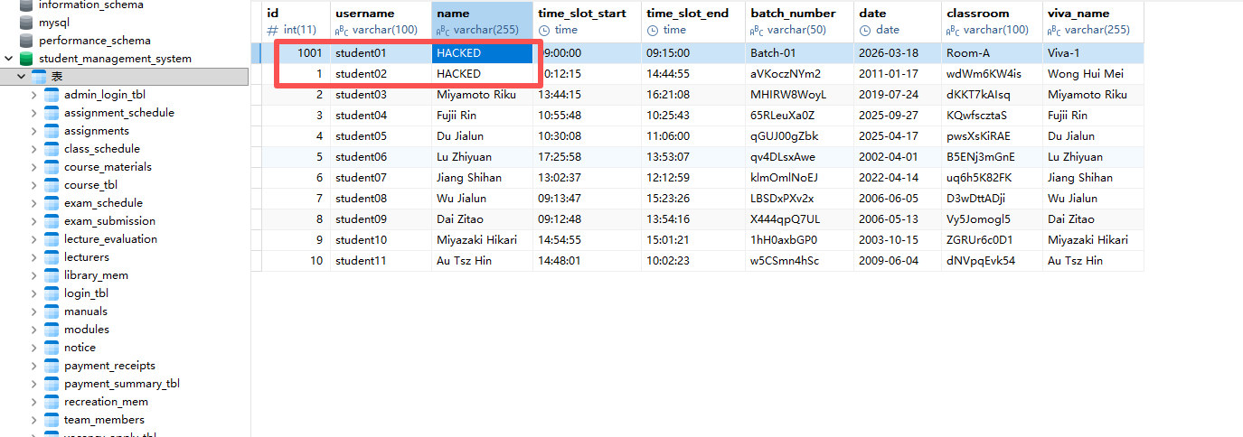 nameforstudent01will have been changed toHACKED.usernamewith any other existing username (e.g.,admin,lec01) – thenamefor that user will also be modified.This vulnerability affects all users of the system. Attackers can maliciously alter the