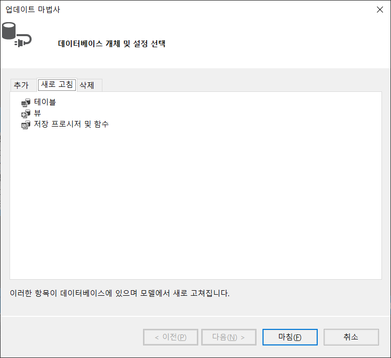 - 그래서, EntityFramework 다이어그램에서 우클릭으로 제공하는 '데이터베이스에서 모델 업데이트'메뉴를 실행, 업데이트 마법사를 이용해 DB의 정보를 업데이트하여 문제를 해결함