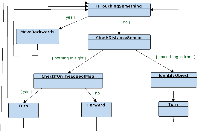 The robot takes one step a step, stops, and sends its current position together with the value (R/G/B). This is repeated until the distance or touch sensor sends an interrupt. For each step, hardcoded time and speed to certain values so that the robot would go exactly 5cm each step. This makes it easier for us to keep track of where it is in the map. We hold a 256x256 array for position information. It is a character array and accepts the following values: